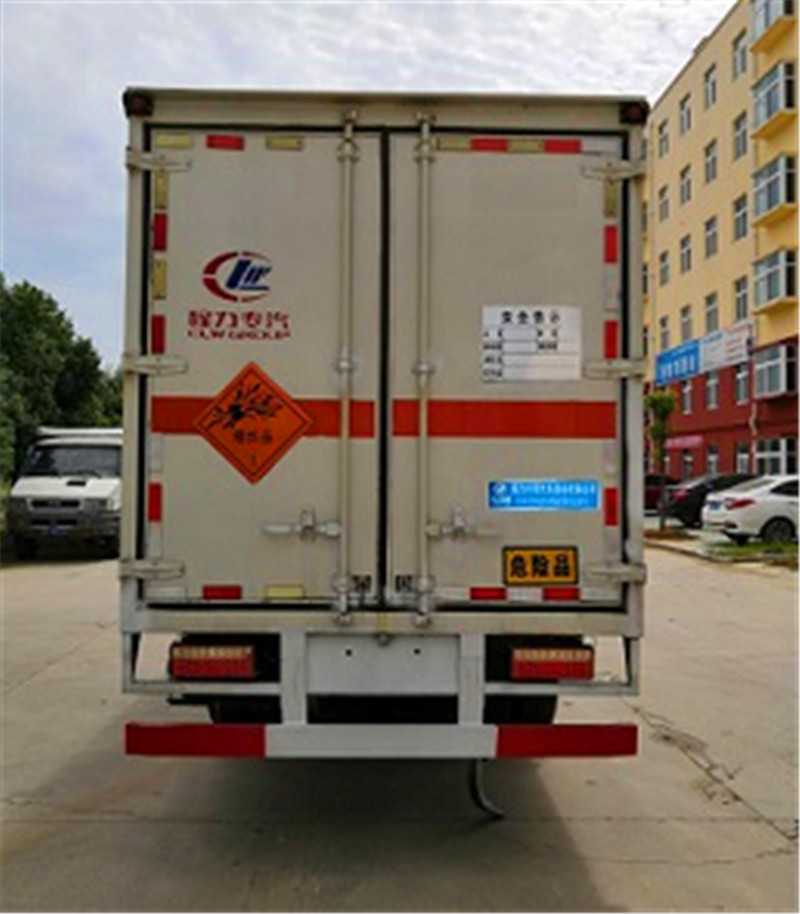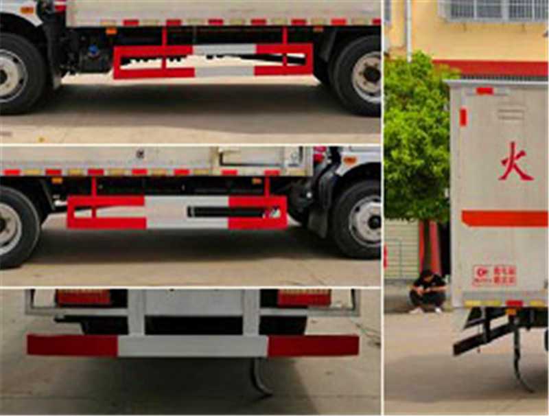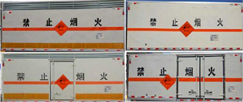 其它 | 該車適用于運輸危險品。廂體頂部封閉,不可開啟。選裝右側箱體不開門,選裝側門型式及位置。危險貨物運輸車輛的類型(EX/Ⅲ型車輛)。僅采用底盤子午線輪胎和帶ABS的底盤,該車前輪安裝盤式制動器,前置排氣管,裝配限速裝置,限速80km/h。安裝帶有衛星定位功能的行駛記錄儀。安全裝置為導靜電帶,用于防止靜電。防護材料:Q235B碳鋼,連接方式:左右側面及后下部防護均采用焊接連接,后部防護斷面尺寸(mm):120×50,后部防護離地高度(mm):500。整車長/軸距/后懸對應關系為(mm):7150/4050/1970,7150/3950/2070,7100/3800/2170。運送爆炸品的品名:黑火藥,壓縮黑火藥,電(非電)引爆雷管,爆破炸藥,導爆索,點燃導火索。運送爆炸品的項號:1.1D,1.1D,1.1B,1.1D,1.4G.1.4G。CY4SK261/CY4SK361/D25TCIF1/D30TCIF1/D40TCIF1/NV30-C6D/YCY30165-60/YCS04190-68發動機油耗值分別為21.3/21.3/21.3/21.3/21.4/21.4/21.3/21.4(L/100km)。ABS型號/廠家:ABS型號:ABS/ASR-24V-4S/4M,廠家:襄陽東風隆誠機械有限責任公司。隨底盤選裝駕駛室。 | ||